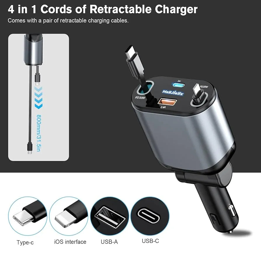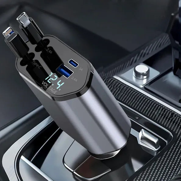 Tired of messy cables in your car? This 4-in-1 Retractable Fast Car Charger delivers up to 100W power for ultra-fast charging of all your devices. Built-in USB and Type-C cables make it perfect for multi-device use while keeping your car neat.